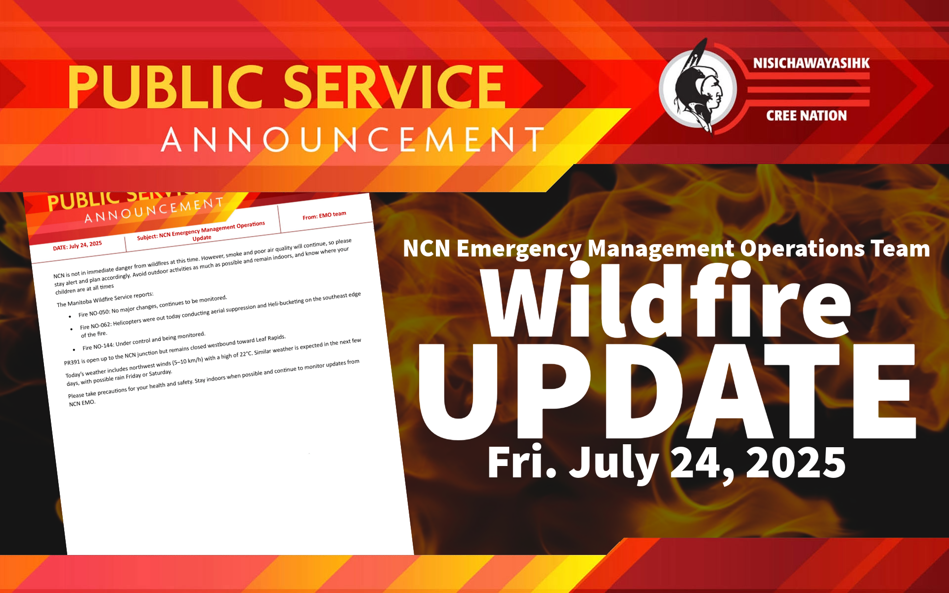 NCN is not in immediate danger from wildfires at this time. However, smoke and poor air quality will continue, so please stay alert and plan accordingly. Avoid outdoor activities as much as possible and remain indoors, especially if you have breathing issues, are elderly, or have young children.